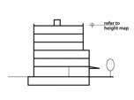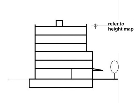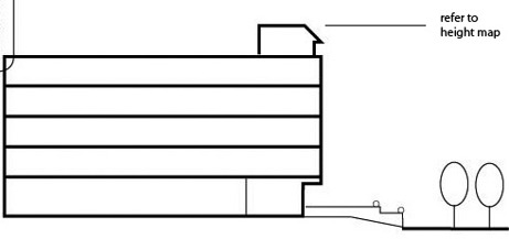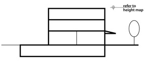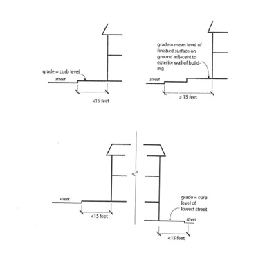 plans, sections, and elevations of the proposed structure drawn to scale, showing the overall dimensions of the exterior faces of the structure; the proposed type and location of any sign or other appurtenances such as overhangs, housing for utilities, and television or radio antennas, and showing in outline form other adjacent buildings and structures; and landscape features within a reasonable distance that will be seen when looking at any elevations of the structure;