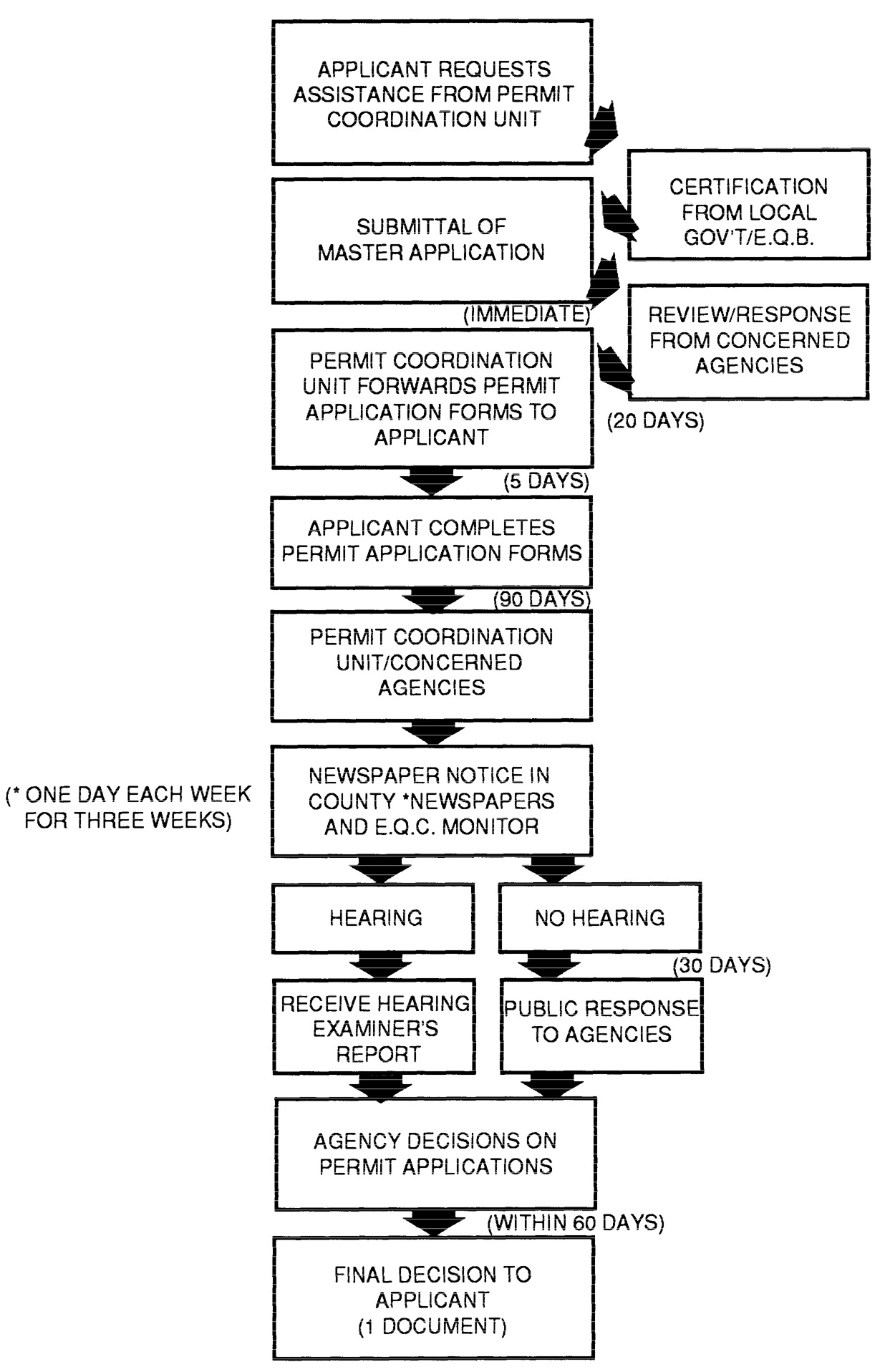 Each notified agency shall respond in writing to the coordination unit within 20 days of receipt by the agency of the master application, advising whether the agency will or will not require a permit for the described project. If the agency responds affirmatively, it shall include application forms and information concerning the specific permit programs applicable to the project as described, and state whether a public hearing is required or appropriate relating to permit requirements for the project. Provided, that a statement whether a public hearing is required or appropriate relating to national pollutant discharge elimination system (NPDES) permit requirements for the project shall not be required at this time. If an agency affirms that a public hearing is required or appropriate, it shall provide a brief statement identifying the reasons.