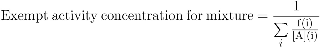 where f(i) is the fraction of activity concentration of radionuclide i in the mixture, and [A] is the activity concentration for exempt material containing radionuclide i.