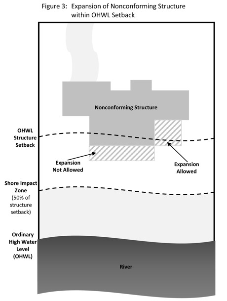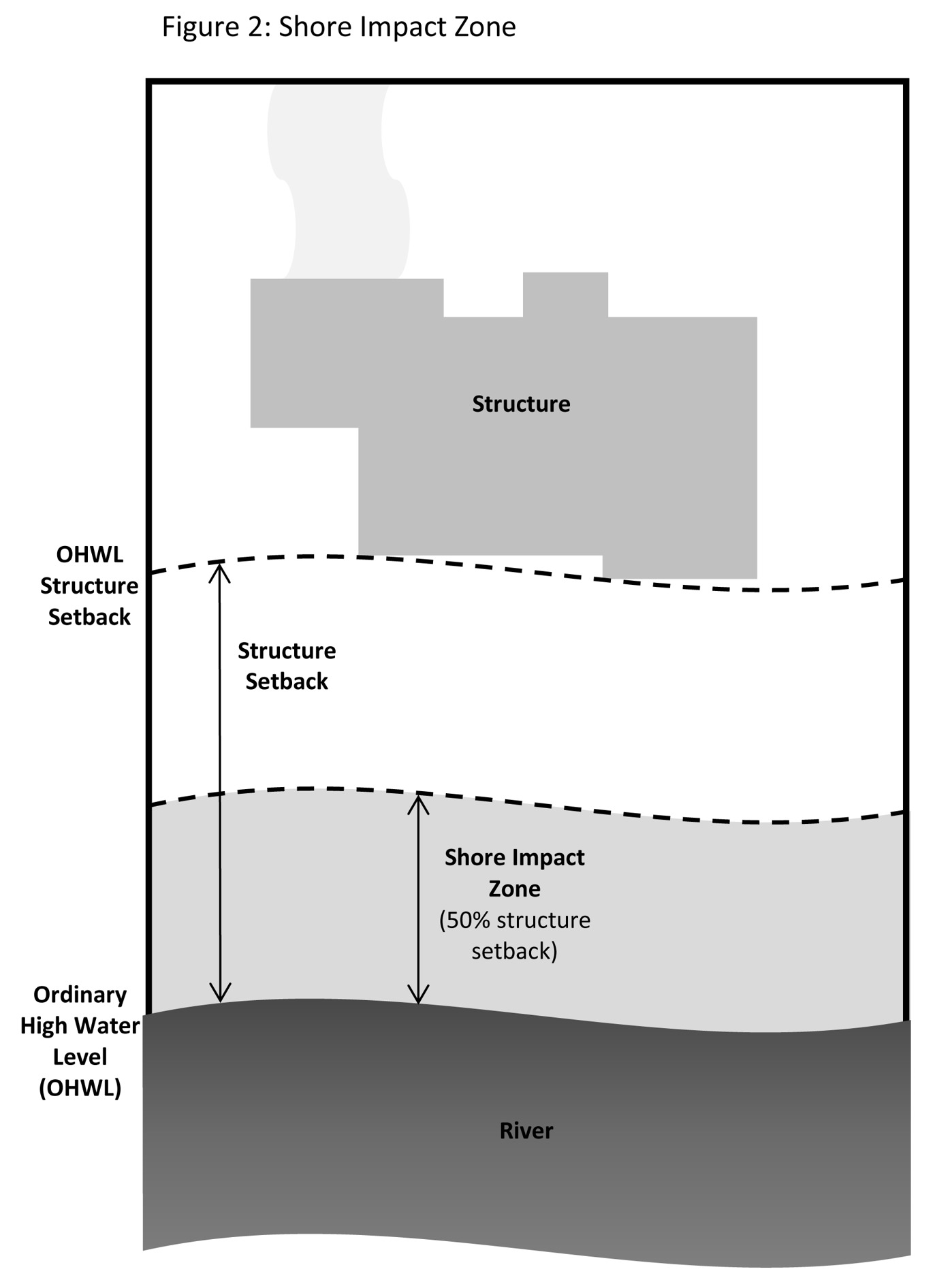 "Shore impact zone" means land located between the ordinary high water level of public waters and a line parallel to it at a setback of 50 percent of the required structure setback or, for areas in agricultural use, 50 feet landward of the ordinary high water level. See Figure 2.