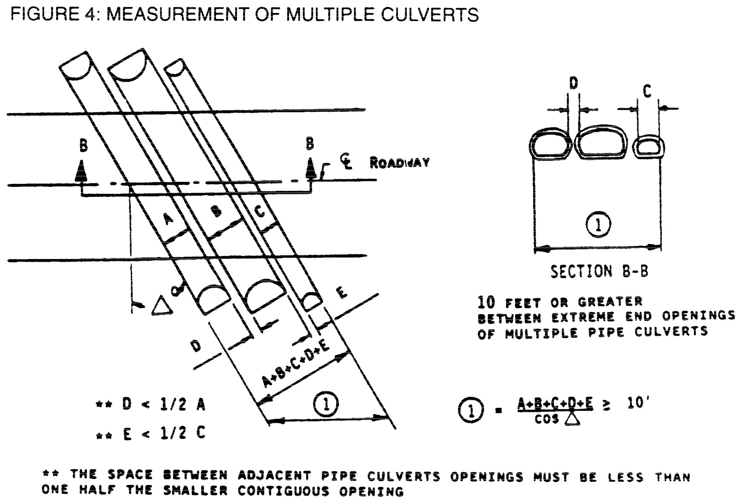 "Bridge" is defined as a structure including supports erected over a depression or an obstruction such as water, highway, or railway, having a track or passageway for carrying traffic or other moving loads, and having an opening measured horizontally along the center of the roadway of ten feet or more between undercopings of abutments, between spring line of arches, or between extreme ends of openings for multiple boxes. Bridge also includes multiple pipes where the clear distance between openings is less than half of the smaller contiguous opening. Illustrations of measurements are shown as Figures 1 to 4. This definition of a bridge includes, for application of parts 8810.8000 to 8810.8500, only those railroad bridges over or under a public highway or street.